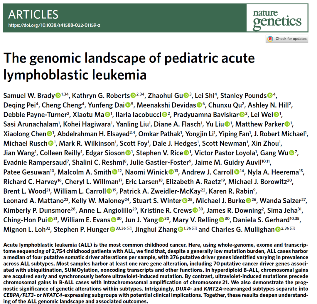 儿童急性淋巴细胞白血病(ALL)是最常见的儿童癌症,由B系或T系淋巴祖细胞发展而来。ALL存在超过30种基因亚型,具有不同的预后重要性。