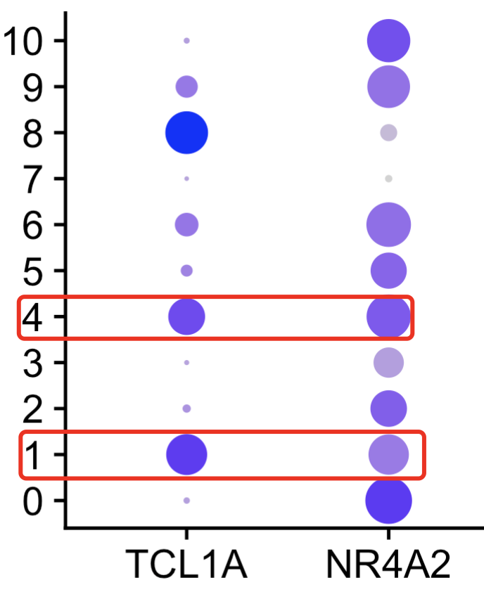 前面我们提到了 我们的naive主要是可以拆分成为RNA_snn_res.0.5这个分辨率下面的 亚群1和4 ,但是我们看它的top基因的时候,基本上跟张泽民老师的两个naive亚群的基因(TCL1A, NR4A2)没有重叠,如下所示可以看到 亚群1和4 并不是在TCL1A, NR4A2两个基因有表达量的特异性 :