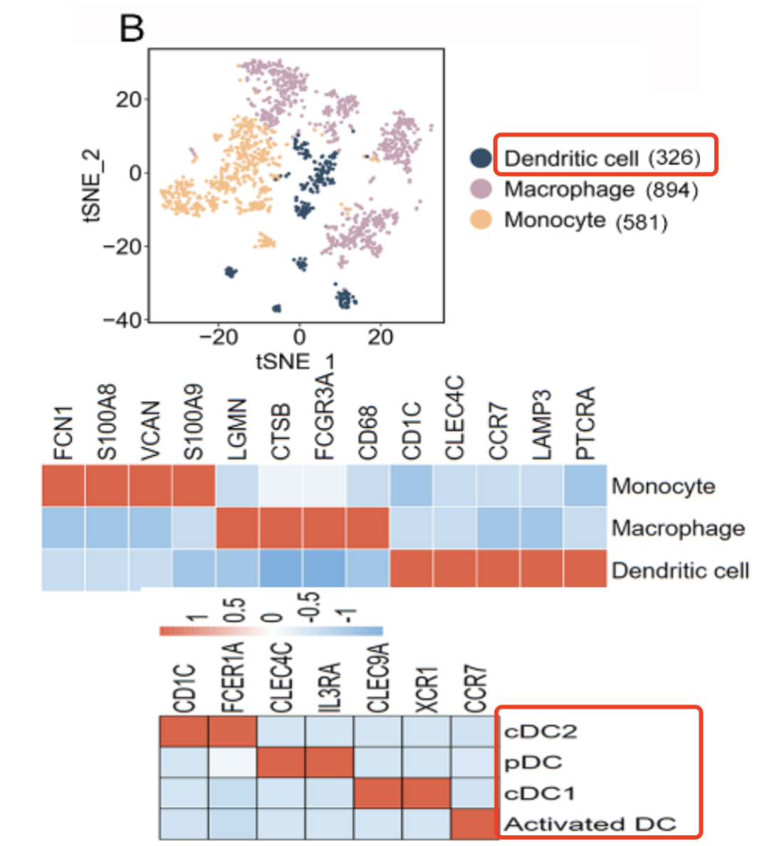 然后就是可以针对单核巨噬系统细胞继续细分,就是单核细胞和巨噬细胞,然后是树突细胞。最后树突细胞又是可以继续细分,如下所示: