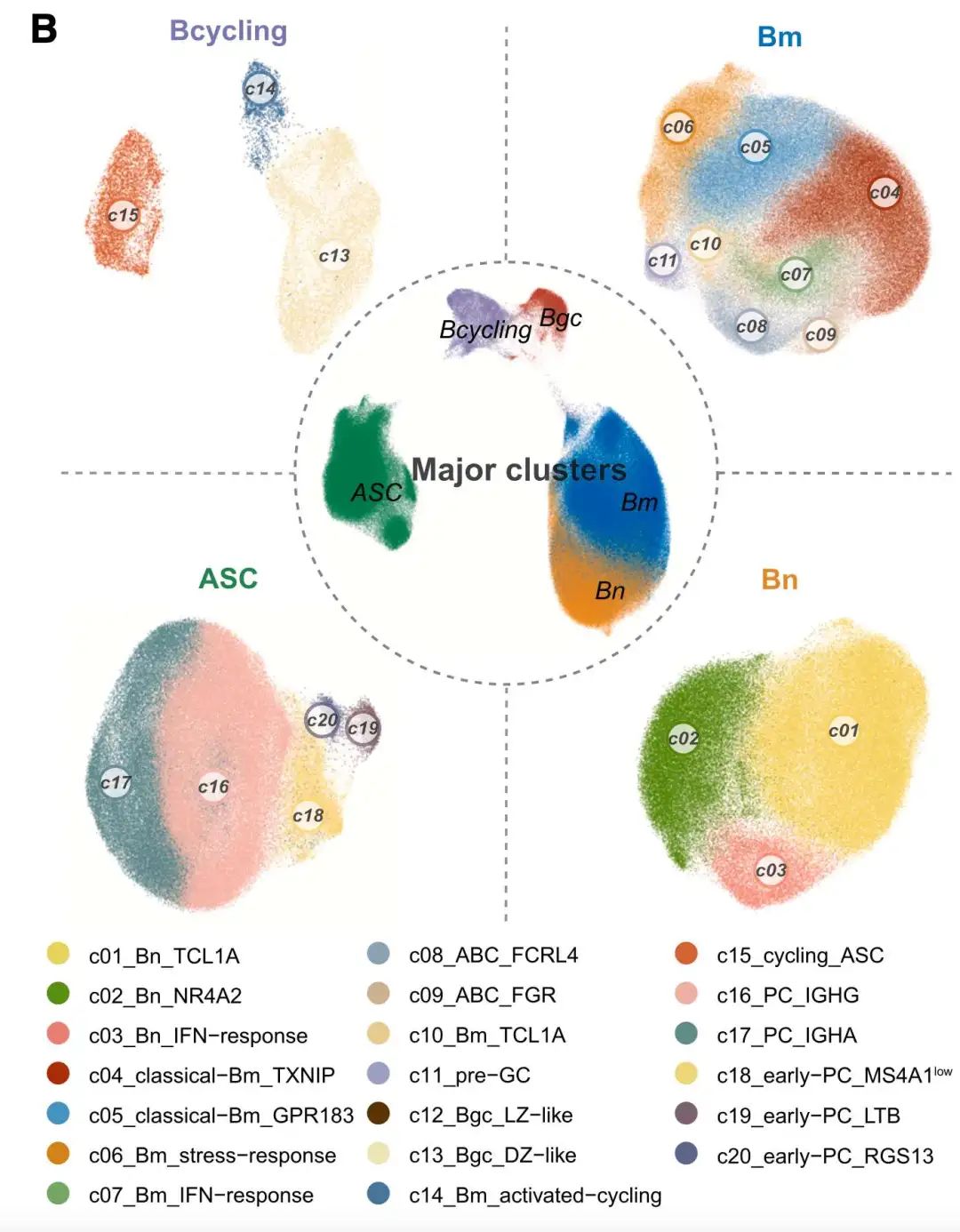 在张泽民老师的单细胞文章:《Pan-cancer single-cell dissection reveals phenotypically distinct B cell subtypes》就是针对这些更细致的b细胞亚群进行了解释,如下所示 :