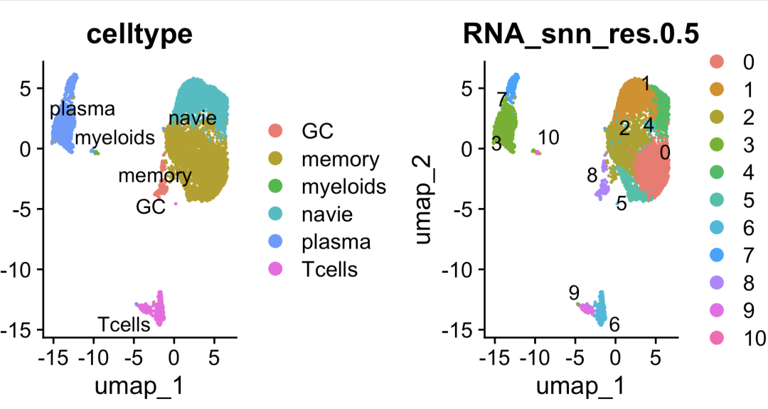 但这个并不意味着,它只能说是区分成为这些单细胞亚群。我们默认使用的是RNA_snn_res.0.1,很简单的提高一下分辨率到RNA_snn_res.0.5,就可以看到我们的所谓的稳定的b细胞4大亚群其实是可以裂变的 ;
