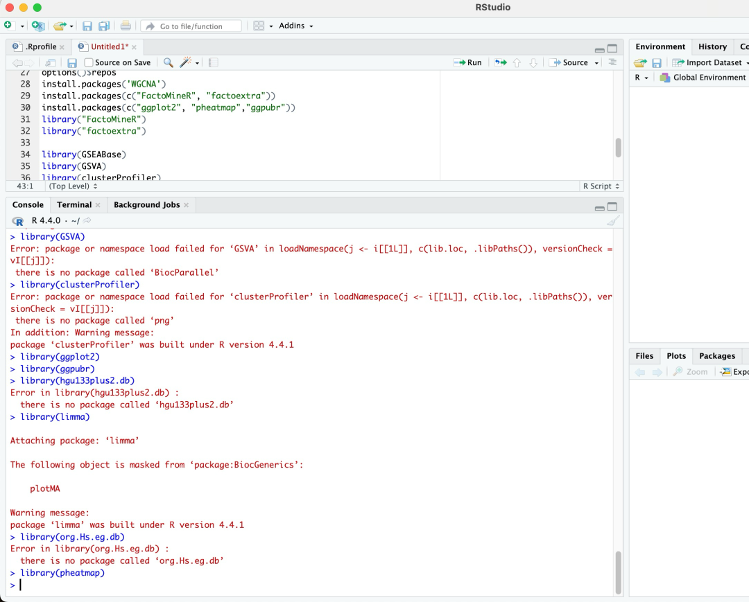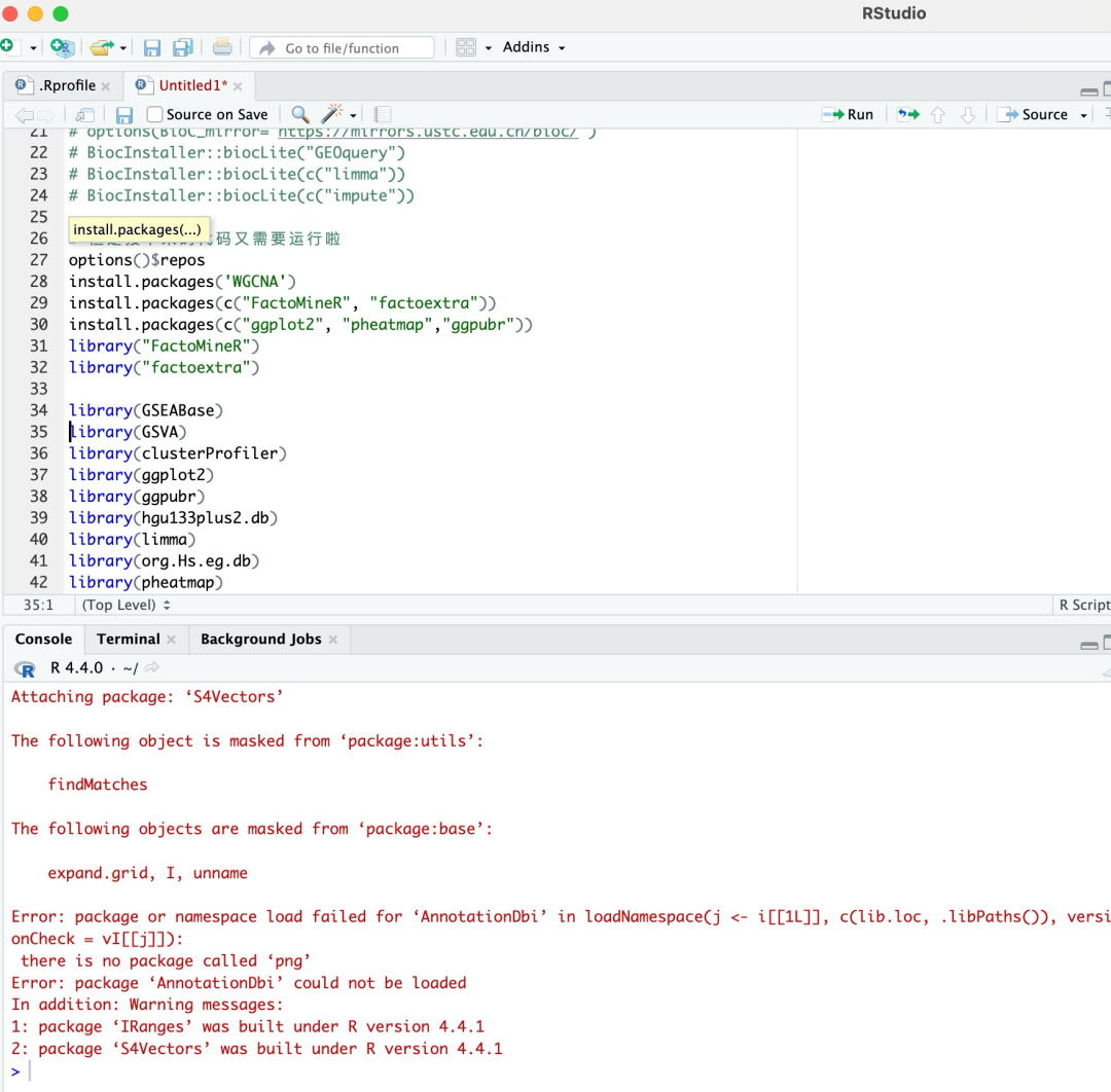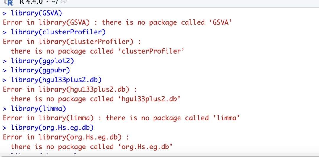 这些包你都没装,光标定位到第一行,重新从第一行开始,每run一行观察左下角窗口的输出信息,没有关键词 error 且返回一个大于号 > 再run下一行。如果遇到error,先尝试从群公告答疑文档里找找是否有类似问题及其解决方法,如果没有,再截图并适当描述哈。