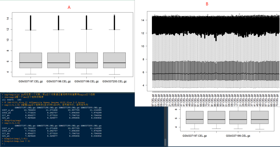 查看表达量箱线图,A图为运行boxplot(exp[,1:4])后的结果,B图为运行boxplot(exp,las = 2)后的结果,这样的结果正常吗?我觉得是正常的,想和各位确认一下是否真的正常