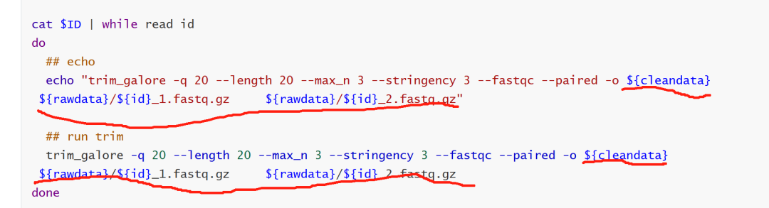 trim_galore -q 20 --length 20 --max_n 3 --stringency 3 --fastqc --paired -o ./ ../../rawdata/SRR1039510_1.fastq.gz ../../rawdata/SRR1039510_2.fastq.gz