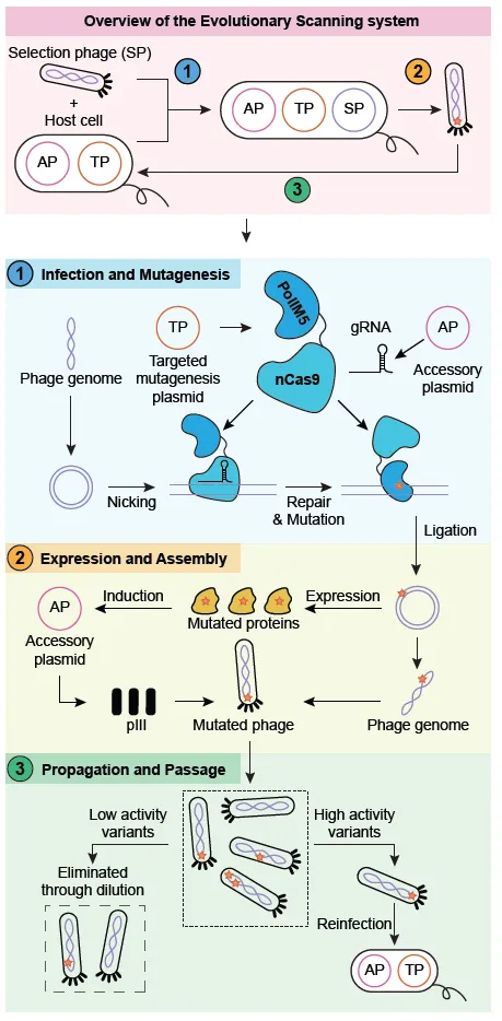 研究人员首先构建了进化搜索系统(Evolutionary Scanning, EvoScan)用以对蛋白进行分区域定向进化,如图一所示。该系统改造了噬菌体辅助的连续定向进化系统(PACE)。其中,突变体系来源EvolvR系统中enCas9-PolIM5复合蛋白,通过构建其诱导表达体系来创建靶向分区域突变质粒(TP)。