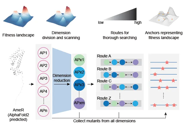 蛋白质作为最重要的生命构建单元之一,其序列和功能之间的映射(适应性景观,Fitness landscape)的针对性研究对于蛋白质理性设计以及工程应用都有极大的意义。目前人们只能对于蛋白质序列-功能关系进行少量低纬度的点采样,例如深度突变搜索(DMS),单位点饱和突变等,或是利用随机建库等方式以极低概率捕获序列与功能耦连的关键信息。一些更高效的定向进化工具如PACE,OrthoRep等会使得蛋白质空间的搜索深度加深,但由于其专注于产生高适应性突变体的特征使得其对于蛋白功能的全局认知不足。