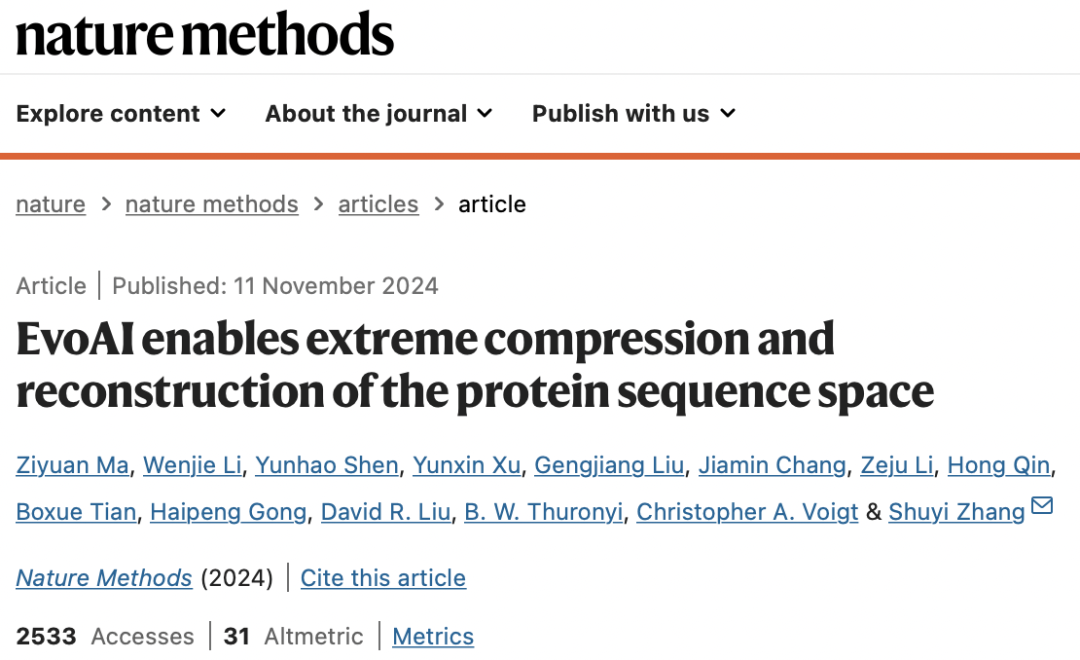 1.Ma, Z., Li, W., Shen, Y. et al. EvoAI enables extreme compression and reconstruction of the protein sequence space. Nat Methods (2024). https://doi.org/10.1038/s41592-024-02504-2