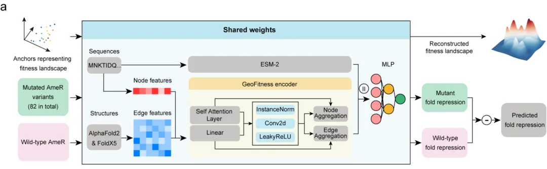 为了理解和重构这个高纬度复杂空间,研究人员设计了与EvoScan配套的深度学习算法,并命名为EvoAI,如图二所示。该方法结合了预训练的GeoFitness模型和蛋白质语言模型(ESM-2),加上多层感知器(MLP),以提高预测蛋白质突变效应的准确性。在本研究中EvoAI利用AmeR蛋白82个突变体的序列-功能映射信息对模型加以训练,并生成了不同于上述突变体的共1093个新蛋白,通过对于预测强度的排序,研究人员测试了预测强度最高的10个突变体,并将其与仅利用传统DMS方法预测得到的10个具备相同突变数量的,强度最高的10个突变体进行强度对比,结果显示,通过EvoAI预测得到的突变体均有显著的功能提升,而DMS方法得到的突变体多数均无显著功能提升,甚至某些突变体不再具备明显的抑制功能。这表明EvoAI系统识别到了通过信息压缩得到的高维度蛋白信息,并有效地生成了具备功能的突变体。