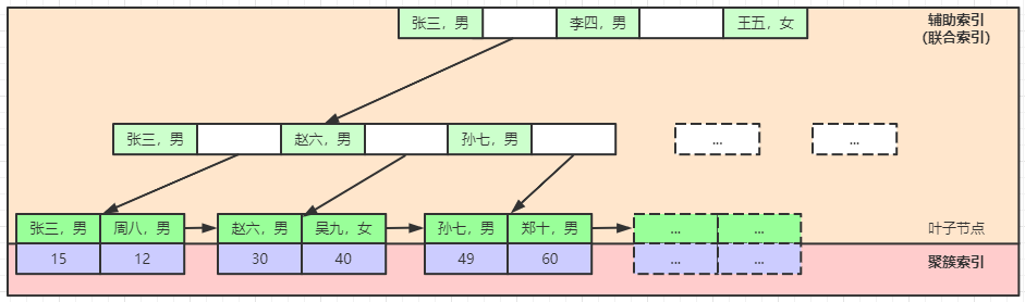 特殊的辅助索引:联合索引,B+树的节点存储的不是一个列数据,而是多个列数据,按照定义的顺序构成一个节点。