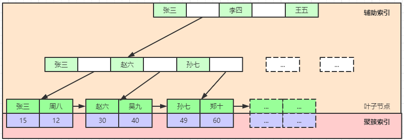 表中除了聚簇索引外其他非聚簇索引成为二级索引或者辅助索引,辅助索引中的叶子节点不再挂载非索引数据,而是存储聚簇索引的索引值