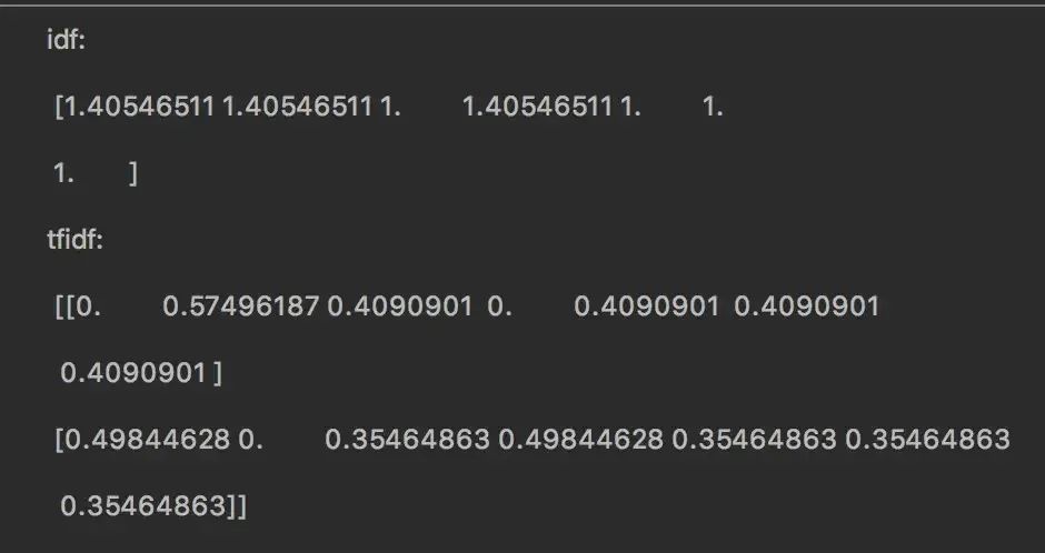print('tfidf:\n', tfidf_matrix.toarray()) # 查看tf-idf