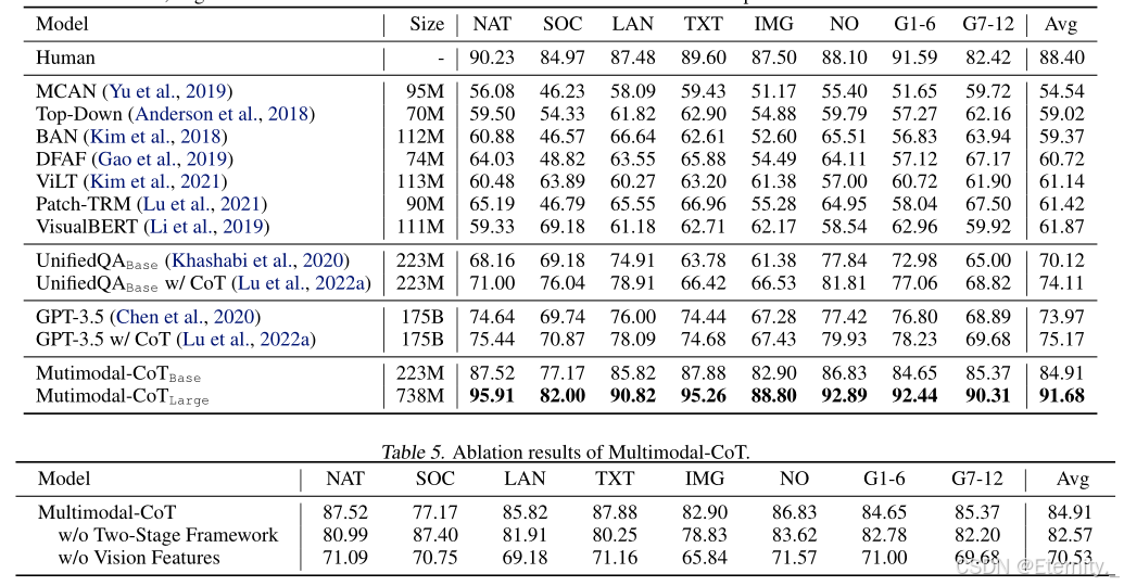 表4显示了主要结果。Mutimodal CoTLarge比GPT-3.5高16.51%(75.17%→91.68%),并超过人类表现。具体而言,在8个问题类别中,Mutimodal CoT Large的得分为21.37%(67.43%→88.80%)的性能增益。与现有的UnifiedQA和GPT-3.5方法相比,这些方法利用上下文中的图像字幕来提供视觉语义,结果表明使用图像特征更有效。此外,根据表5中的消融研究结果,我们的两阶段框架有助于获得优异的结果。总体而言,结果验证了多模态的有效性以及通过两阶段框架使用1B模型实现CoT推理的潜力。
