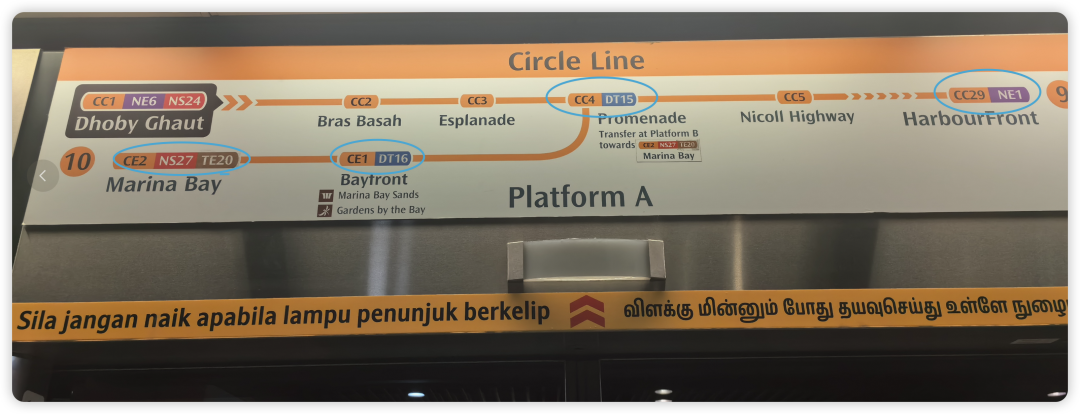 比如在新加坡地铁环线(CCL)的Promenade(宝门廊)站点,我看到了如下的线路指示牌。其中除了四种语言的站点名称(包含具体的业务意义,如同产品名称),还有线路+数字编码,比如 CC14、CC15.