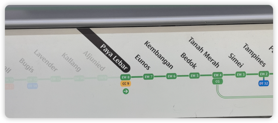 这一理念体现在每个线路、每个站台的每个细节之中,比如站台上方的指示牌如下所示,这是一个东西线 EWL 和环线 CCL 的换乘站(如下图)。