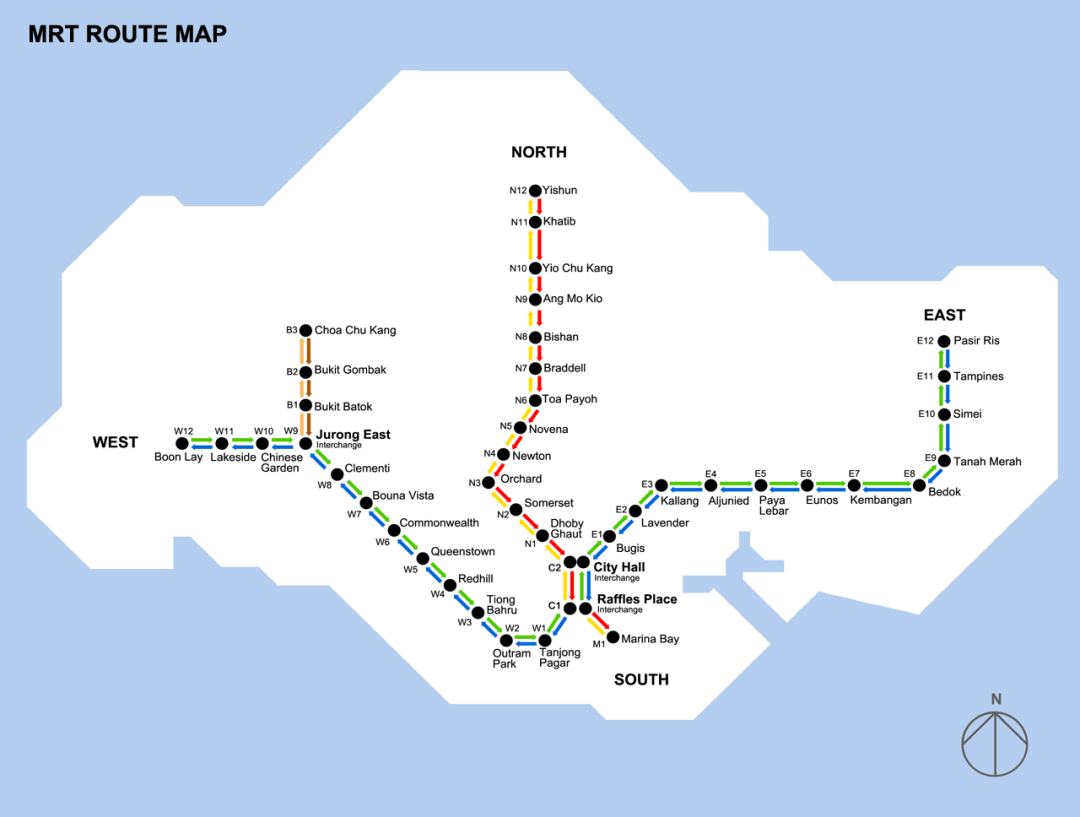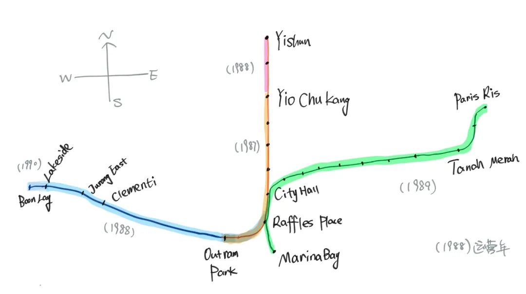 1987年,新加坡第一条地铁开始营业,1988 年新加坡地铁宣布正式运营,次年扩展到东部的 Paris Ris(如下图所示)。如果你要为新加坡地铁命名,是不是很自然地称之为1号线、2号线?