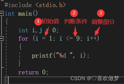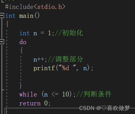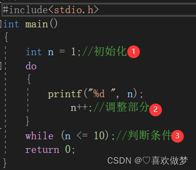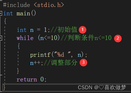 比较:while的初始化、判断条件、调整部分是比较分散的,for循环语句的比较集中,所以for循环语句会更优化一些,使用的也比较多