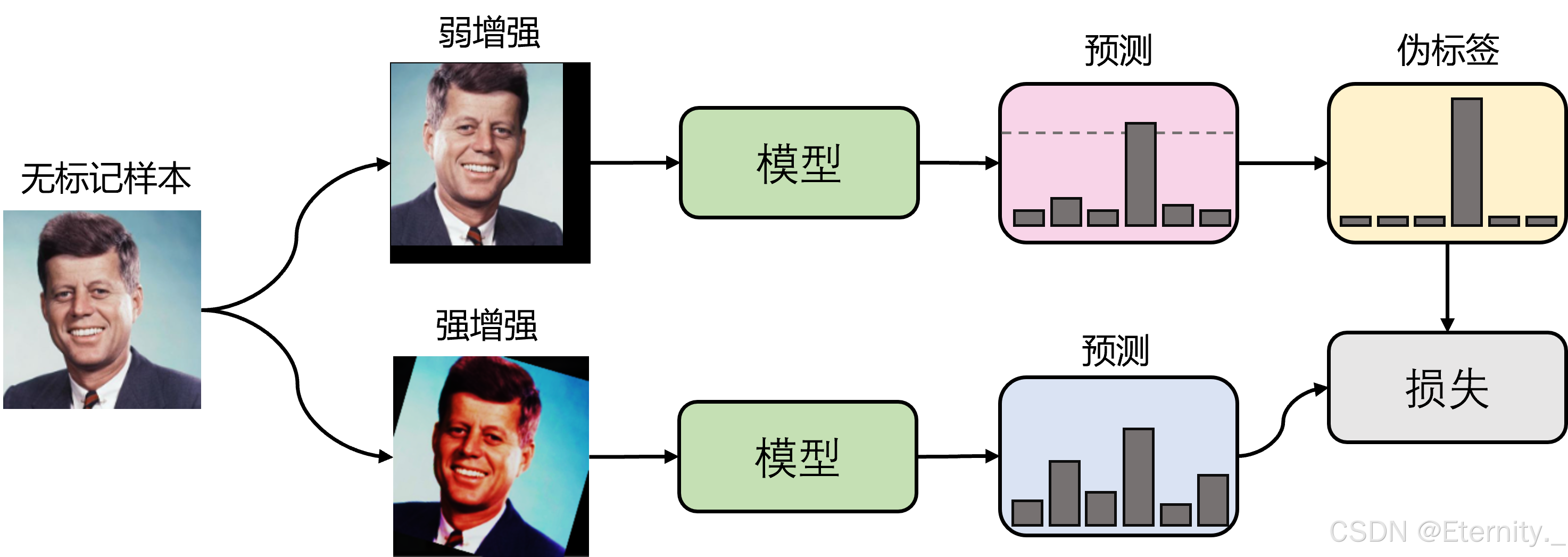 FixMatch 对每个无标签样本计算一个伪标签,然后在标准交叉熵损失中使用该标签。为了获得伪标签,我们首先计算模型对给定无标签图像的弱增强版本的预测类别分布: