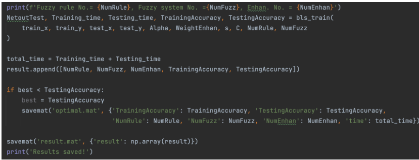 | | 调用 bls_train(train_x, train_y, test_x, test_y, Alpha, WeightEnhan, s, C, NumRule, NumFuzz)