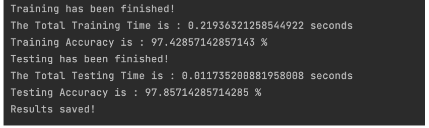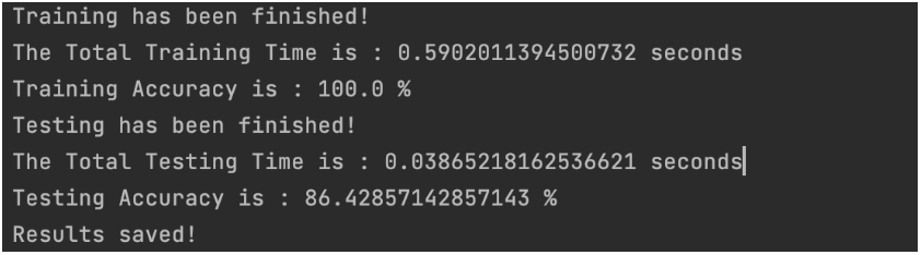 接下来就可以得到我们输出的结果啦,训练精度、测试精度、训练时间、测试时间都会被打印出来,大家如果想多使用一些评价指标,也可以自行添加需要的指标,具体方法可以参考我之前的博客。