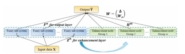 FBLS是一种结合了随机向量功能链接神经网络和伪逆理论的神经网络模型。该设计允许系统快速学习和适应,无需重新训练。如图3所示,该模型由输入层、模糊子系统层、增强层和输出层组成。在模糊子系统层,使用模糊规则从输入数据生成多个模糊子系统。这些模糊子系统随后使用随机权重转换为增强节点。通过将所有模糊子系统和增强节点连接到输出层来计算输出。