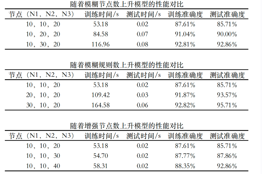 模型的分类准确率基本在90%左右,可以看到固定其他变量不变,模糊节点数、模糊规则数和增强节点数的增加都会带来模型性能的提升,但相应的训练时间也会一定程度的增加。