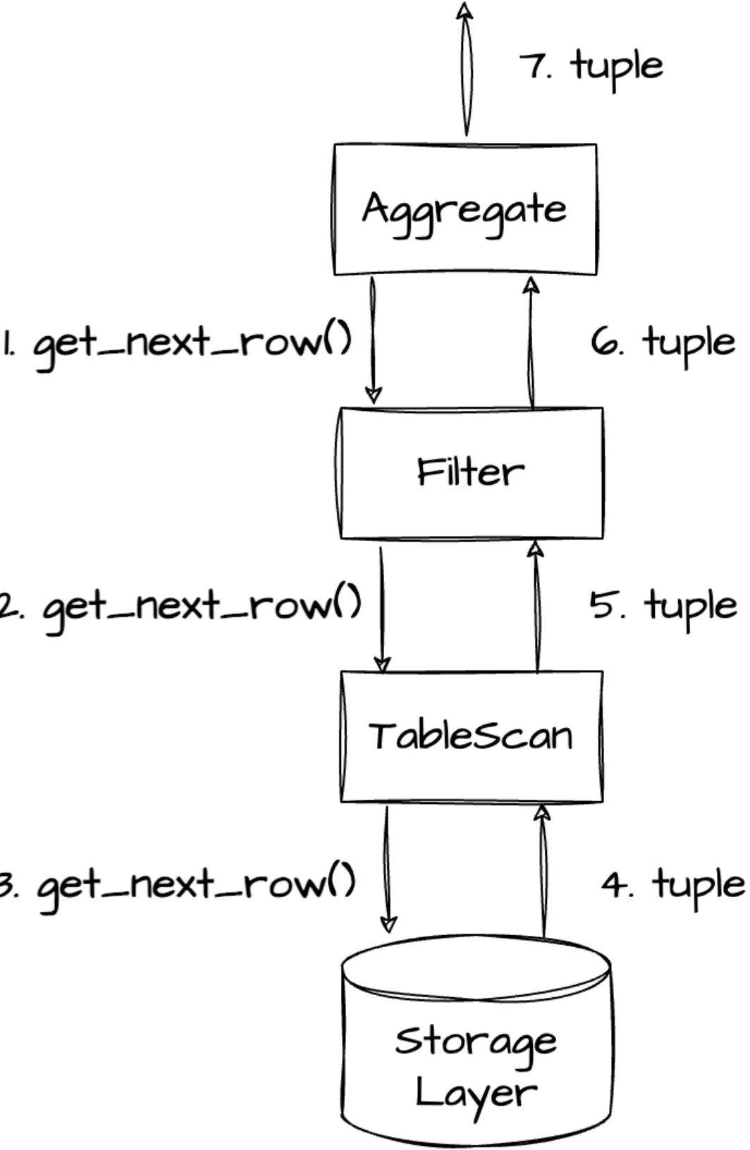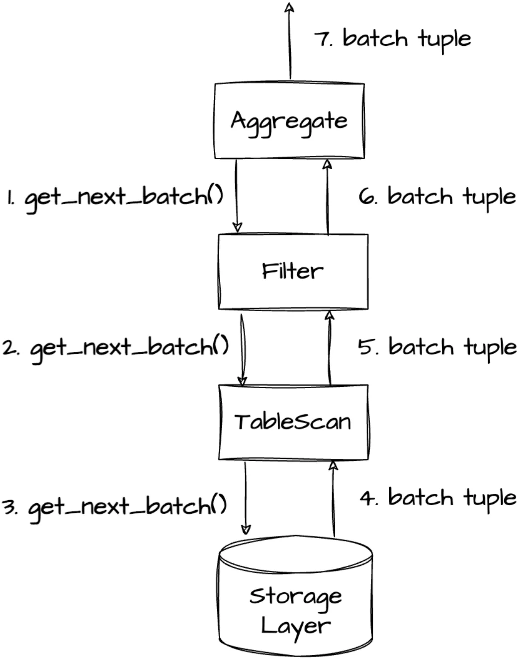 火山模型(Volcano Model): 也称为迭代模型,将查询计划分解为多个迭代器,每个迭代器实现一个next()接口,查询执行时,数据按行迭代并自底向上被拉取(Pull Based)处理。该模型灵活性高并且易于实现,但每次单行数据处理,需要多次调用next()接口,导致虚函数调用开销增加。