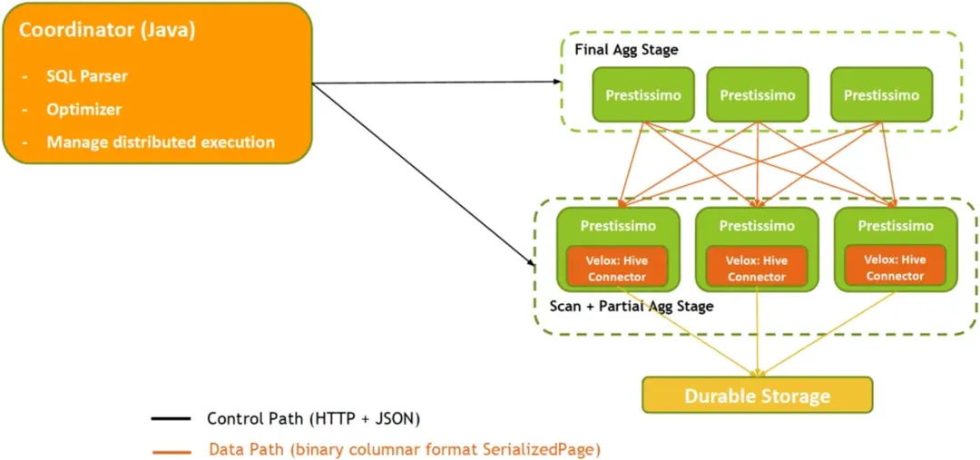 Prestissimo 由Meta于2020年创建,在Presto中引入Velox库扩展向量化执行,其中Presto Coordinator 基于JVM实现 SQL 解析、查询优化以及管理任务分布式执行,使用C++重写Presto Worker,底层的算子数据操作基于Velox执行。