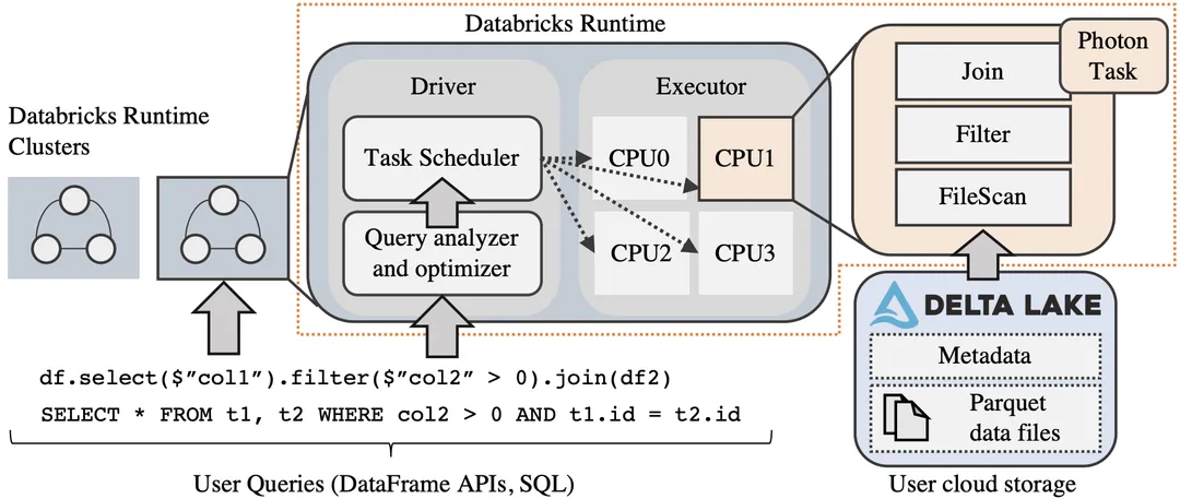 Databricks 2022年推出商业化产品 Photon ,旨在增强Spark计算而写的Native C++ 向量化计算引擎。其执行层架构如图所示[2],Photon向量化计算基于最底层的Task调度粒度处理 。扩展新的转换规则将原物理计划转为Photon物理计划,在Task级别实现向量化计算,提供高效的湖仓一体计算模式。Photon向量化执行引擎取代了已有的Spark执行模式(JVM & Codegen)。