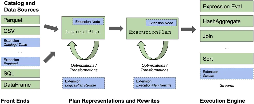 Apache DataFusion: 基于 Apache Arrow 实现的可扩展查询引擎,使用Rust语言编写,提供SQL解析和查询优化等功能。架构设计如图所示[3],包括四部分: 1. 前端: 语法/语义解析并转为逻辑计划;2. 逻辑计划: 查询中间表示,包括Expression(表达式)/ Type system(类型系统);Query Plan/ Relational Operators(关系算子);Rewrites/ Optimizations(逻辑计划优化);3. 物理计划: 查询底层表示,主要包括 Rewrites/ Optimizations(物理计划优化); 4. 运行时算子: 分配计算资源,基于Arrow 和RecordBatch批数据处理提供向量化计算能力。