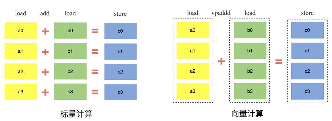 SIMD(Single Instruction Multiple Data) 单指令流多数据流,是一种采用一个控制器管理多个处理器,同时对一组向量数据中每个数据分别执行相同的操作,从而实现空间上的并行计算的技术。即基于SIMD实现一条指令同时处理多个数据,将传统的标量计算转为向量计算,从而减少CPU周期数,提升计算效率。