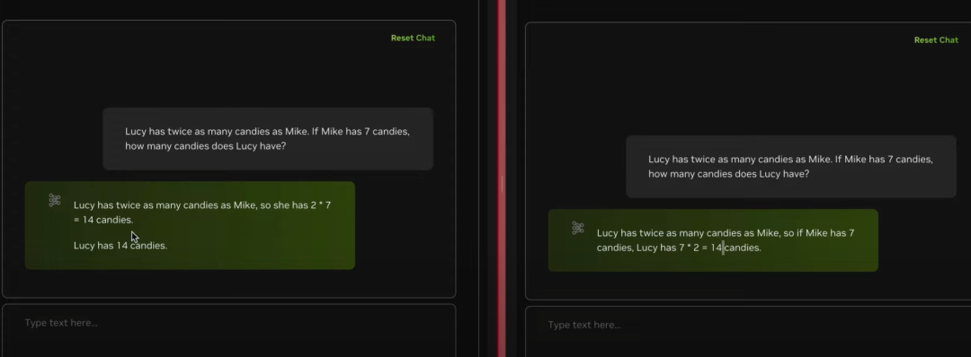 下一个问题是,Lucy有的糖果数量是Mike的两倍。如果Mike有7颗糖果,Lucy有多少颗糖果?答案应该是14。让我们发送并查看答案。答案看起来都正确,所以这次两者也都通过了。