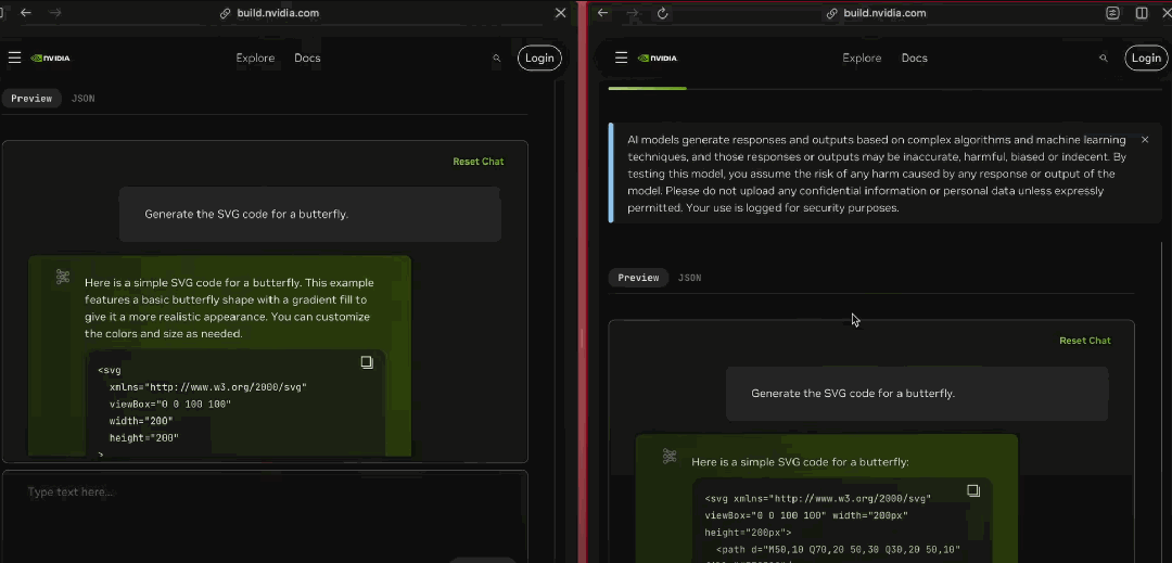 接下来一个问题是,生成一个蝴蝶的SVG代码。让我们发送并查看答案。这里是代码。首先预览E模型的代码,这看起来不像蝴蝶,所以这是失败。现在预览Mini模型的代码,它也不像蝴蝶,所以这次两个模型都失败了。