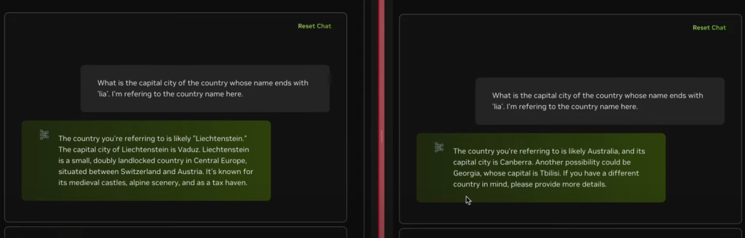 第一个问题是,哪个国家的首都名字以Leah结尾?我指的是国家名字,答案应该是Canberra或任何与Leah押韵的国家首都名字。让我们发送问题并查看答案,顺便说一下,左边的是Mini,右边是E模型(MOE)。