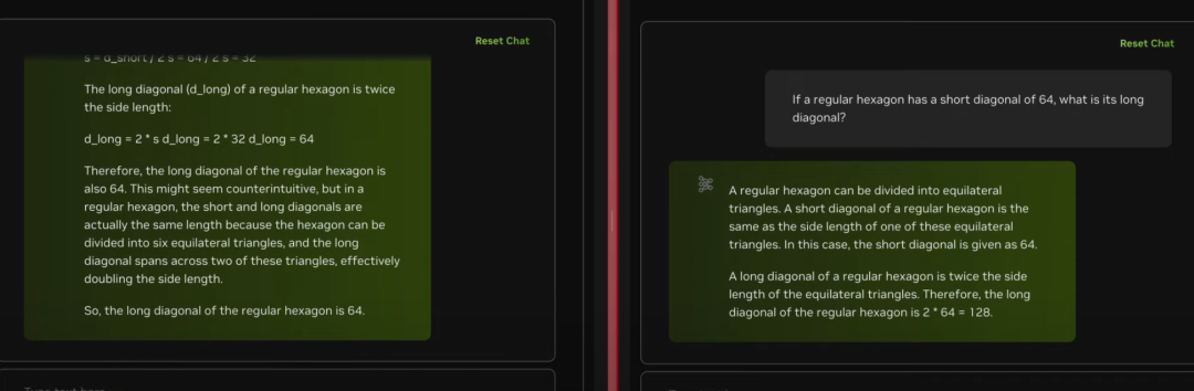 下一个问题是,如果一个正六边形的短对角线是64,那么它的长对角线是多少?答案应该是73.9。让我们发送并查看结果。这里是答案,两个模型都没有正确回答这个问题,所以这次两者都记为失败。