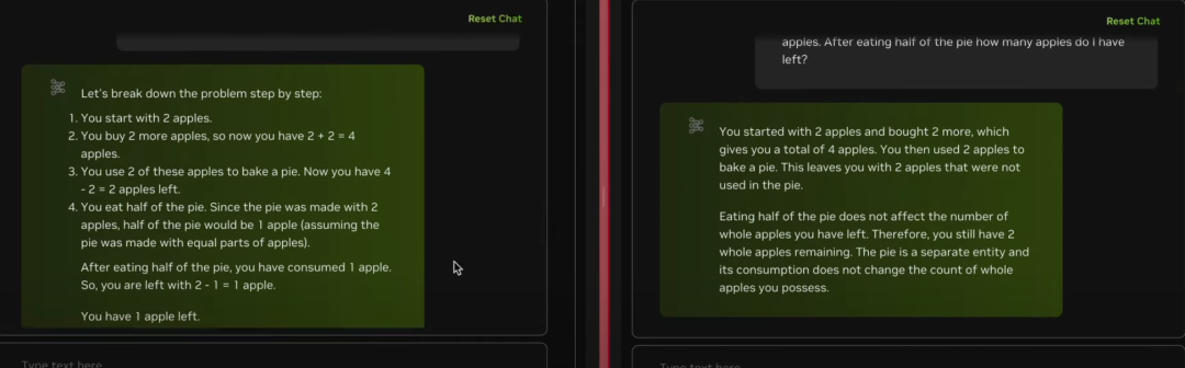 接下来一个问题是,我有两个苹果,然后又买了两个。我用其中两个苹果烤了个派,吃掉了一半派后,我还剩多少个苹果?答案应该是两个。