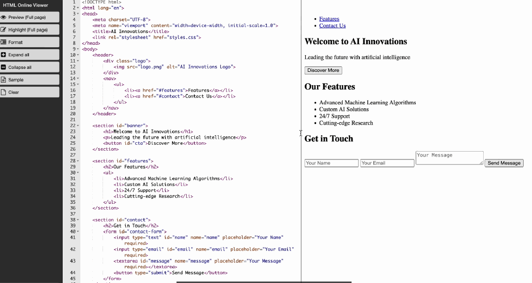 接下来一个问题是,为一家AI公司创建一个登陆页面。页面应包含四个部分:标题、横幅、功能和联系我们。确保页面看起来时尚现代。你可以使用HTML、CSS和JS。让我们发送并查看答案。