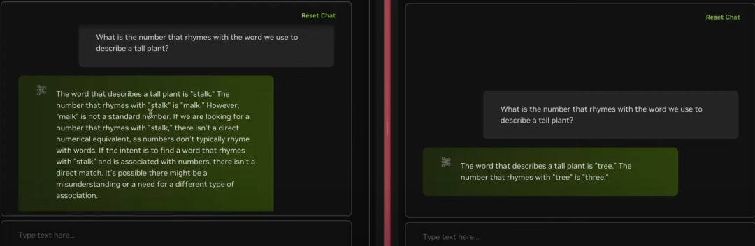 接下来一个问题是,哪个数字与我们用来描述高大植物的词押韵?答案应该是Three(3)。让我们发送问题并查看答案。这里是答案,Mini模型不正确,但E模型正确。所以我们将Mini记为失败,E模型记为通过。