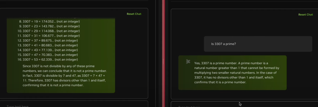 下一个问题是,数字337是质数吗?答案应该是“是”。让我们发送并查看答案。Mini模型不正确,而E模型正确,因此Mini模型记为失败,E模型记为通过。
