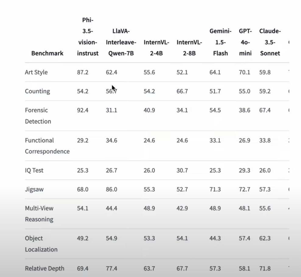 接下来是Phi 3.5 Vision模型,它基本上是带有视觉功能的Phi 3.5 Mini模型,这是一个4.2B参数的模型,其基准测试与Phi 3.5 Mini相似,
