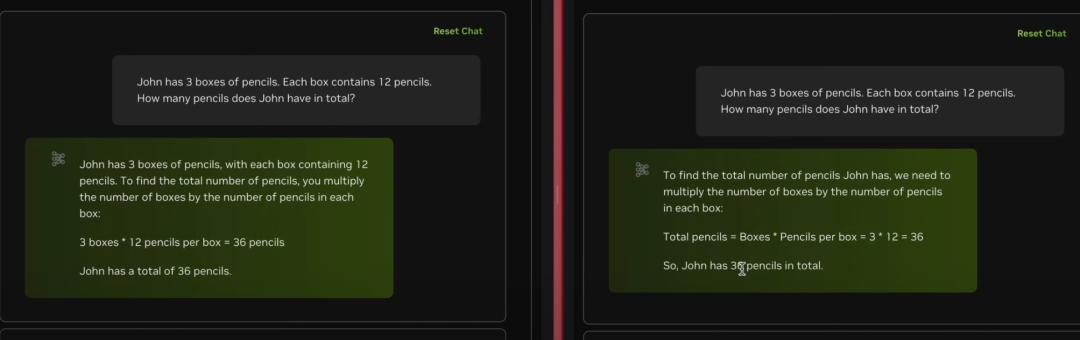 下一个问题是,John有三盒铅笔,每盒有12支铅笔,John一共有多少支铅笔?答案应该是36。让我们发送并查看答案。这里是答案,两个模型都给出了正确的答案,所以这次两者都通过了。