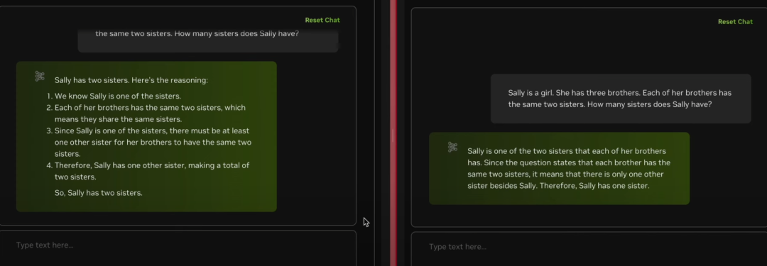 接下来一个问题是,Sally是个女孩,她有三个兄弟,每个兄弟都有同样的两个姐妹。Sally有几个姐妹?答案应该是一个。让我们发送并查看答案。Mini模型再次不正确,而E模型正确,因此我们将Mini记为失败,E模型记为通过。