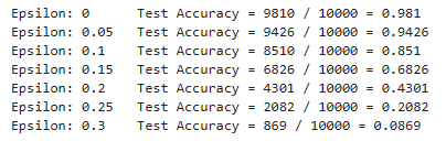 print("Epsilon: {}\tTest Accuracy = {} / {} = {}".format(epsilon, correct, len(test_loader), final_acc))