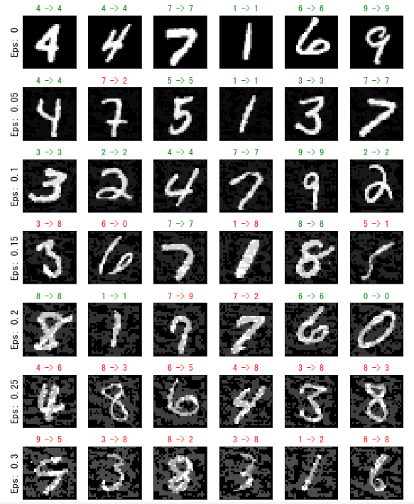 实验的最后,我们可以将不同扰动值Epsilons下的对抗样本进行可视化。在每张对抗样本的上方会显示样本的原始标签以及被攻击后的分类标签,从图中我们不难发现,当扰动值为0.15时,模型出现分类出错的情况,这证明攻击有效,随着扰动值不断增加,攻击成功率越高,攻击效果越好。