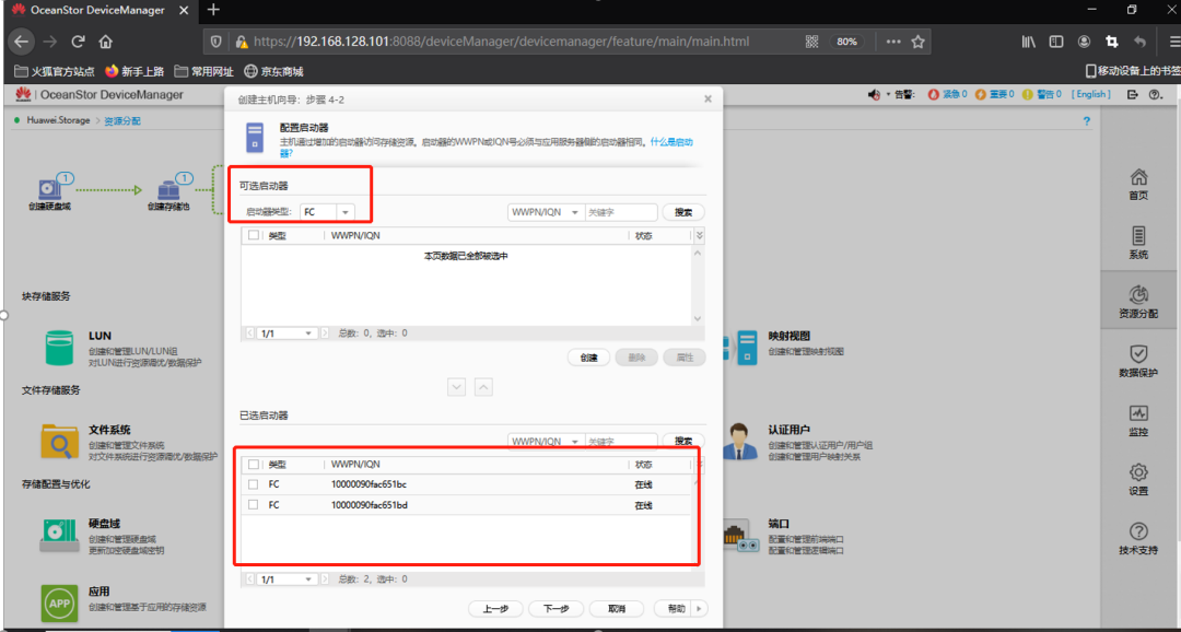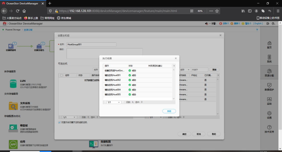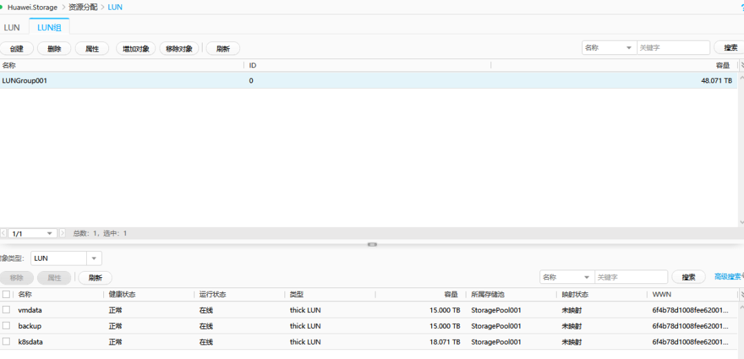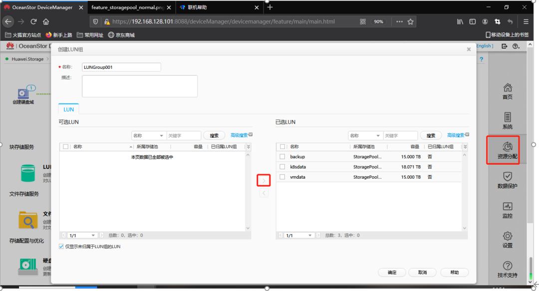 点“资源分配”,点“创建LUN组”,选择对应的LUN