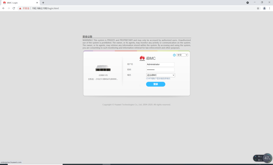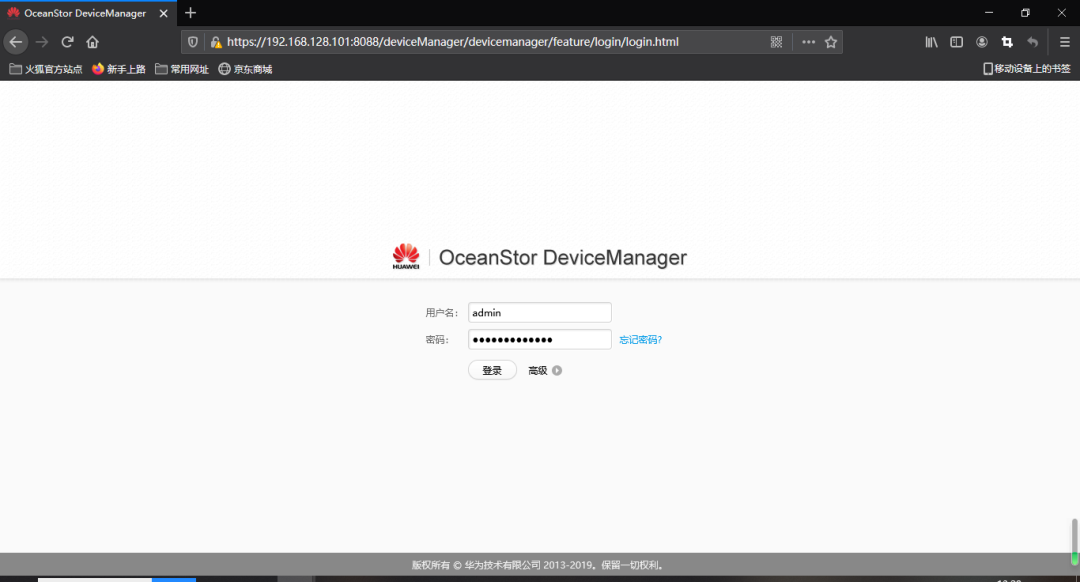 登录存储https://192.168.128.101:8088 用户名*****(password) 密码 Huawei12#$,点高级
