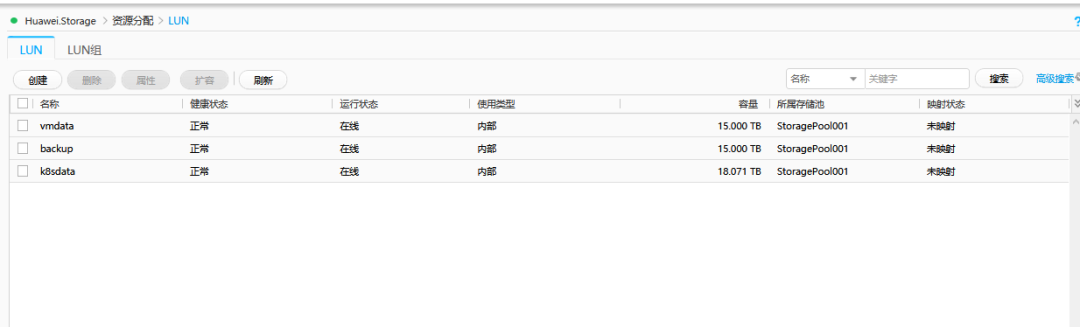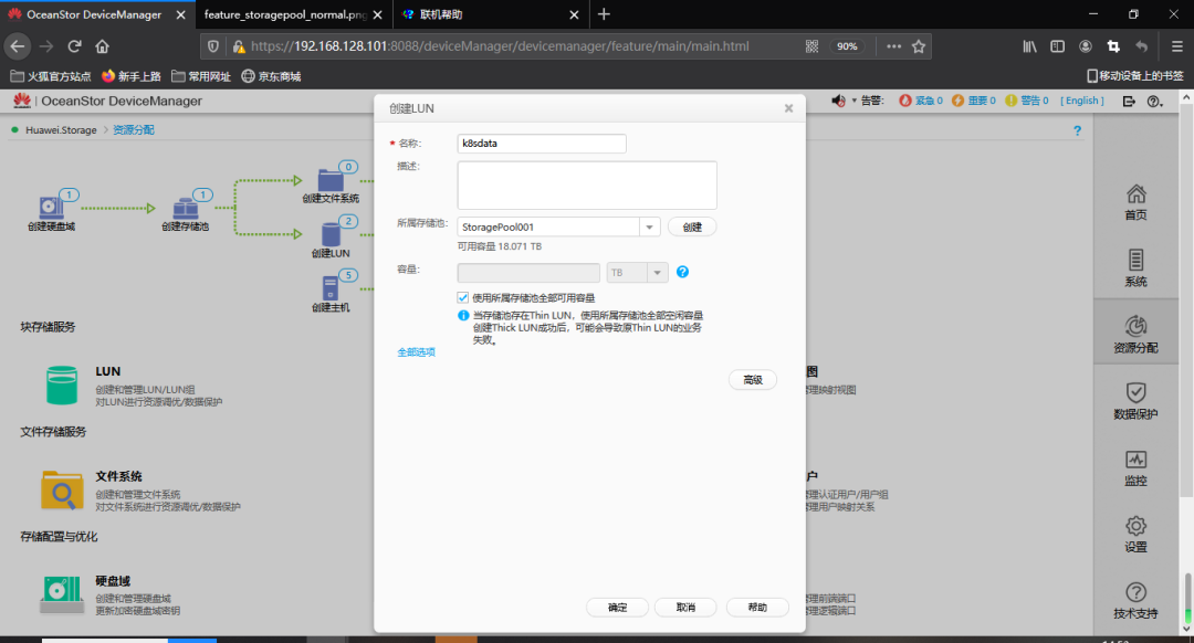 点“资源分配”,“创建LUN”,输入对应LUN 名称和对应存储池,以及容量
