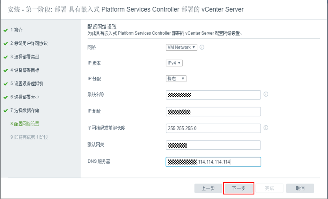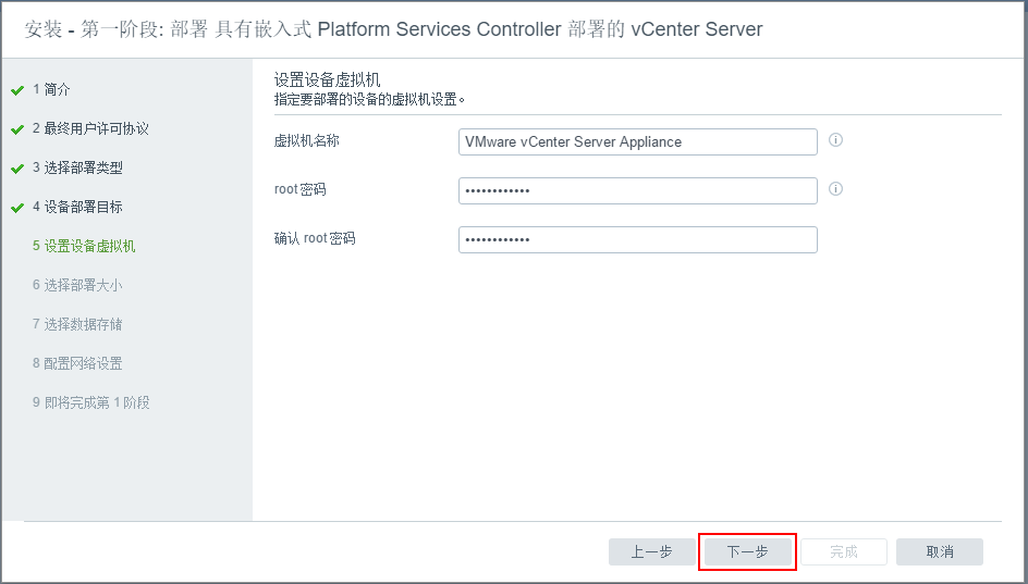 接下来指定VCSA这台VM在ESXI主机中的虚拟机名称(非系统名称)以及VCSA的root密码。(注:不是登录vCetner Web界面的密码,是VCSA主机的密码)