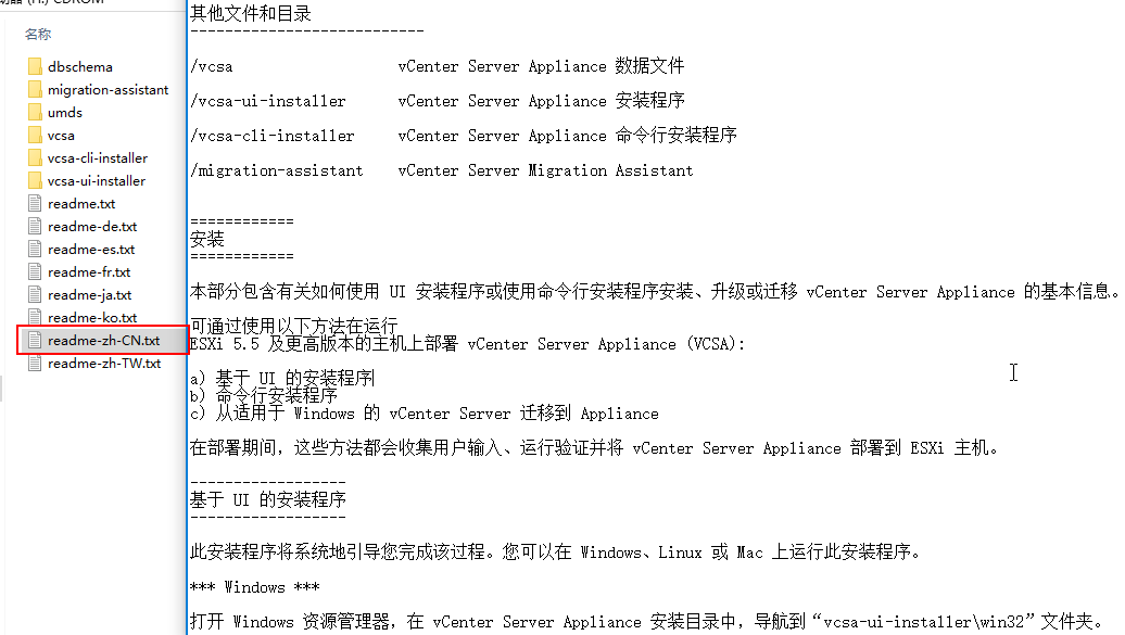 首先打开下载好的VCSA6.5安装包,通过根目录中的Readme记事本就可以知道该VCSA的安装包各个路径的文件和作用以及安装方法