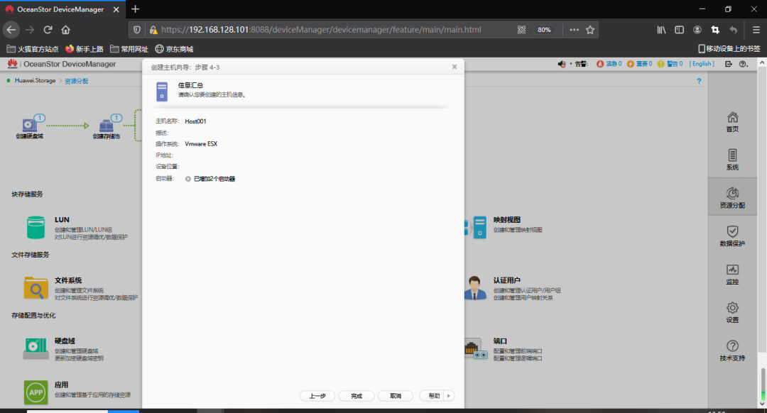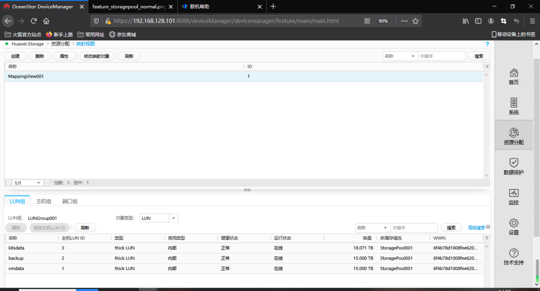 点击“资源分配”,点击“创建映射视图”,选择对应的LUN组合主机组
