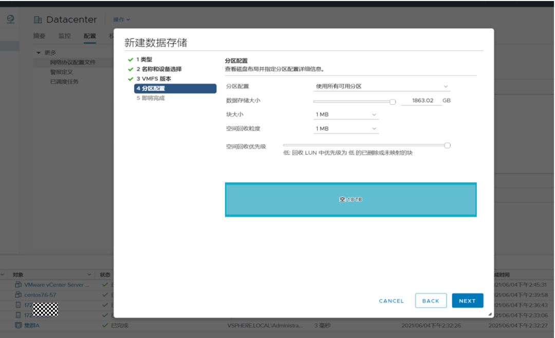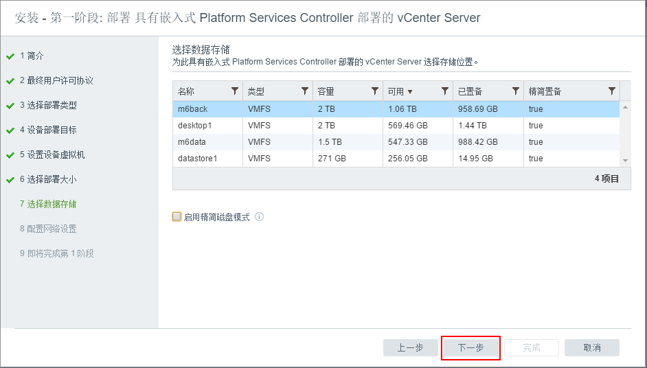 勾选图中的“启用精简磁盘模式”会实时占用磁盘空间,随着数据的增大,空间会占用的越来越多,如果不勾选则占用前方建议的全部空间,选择完成后点击“下一步”。